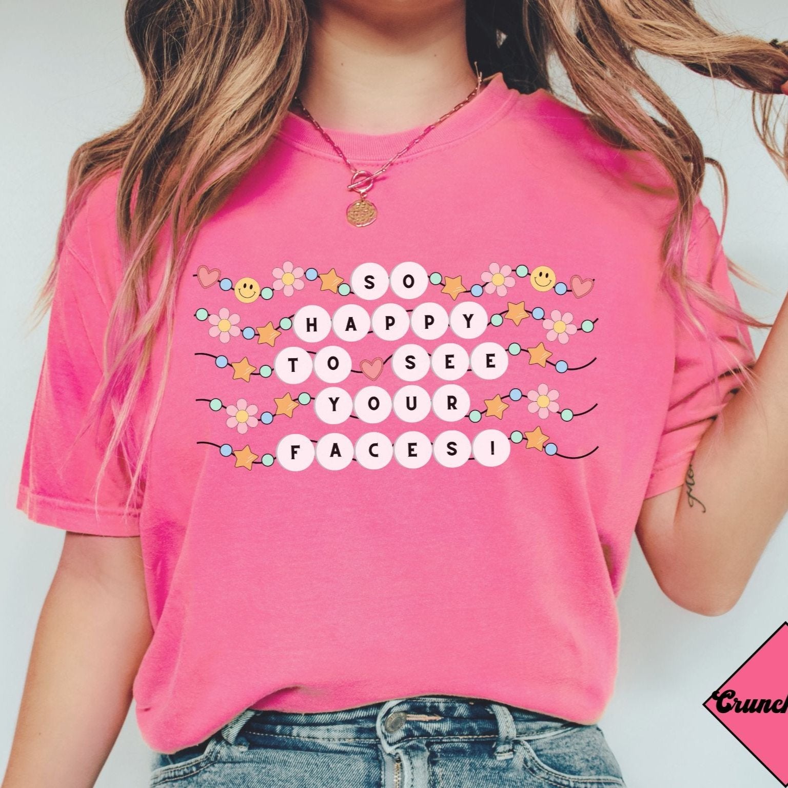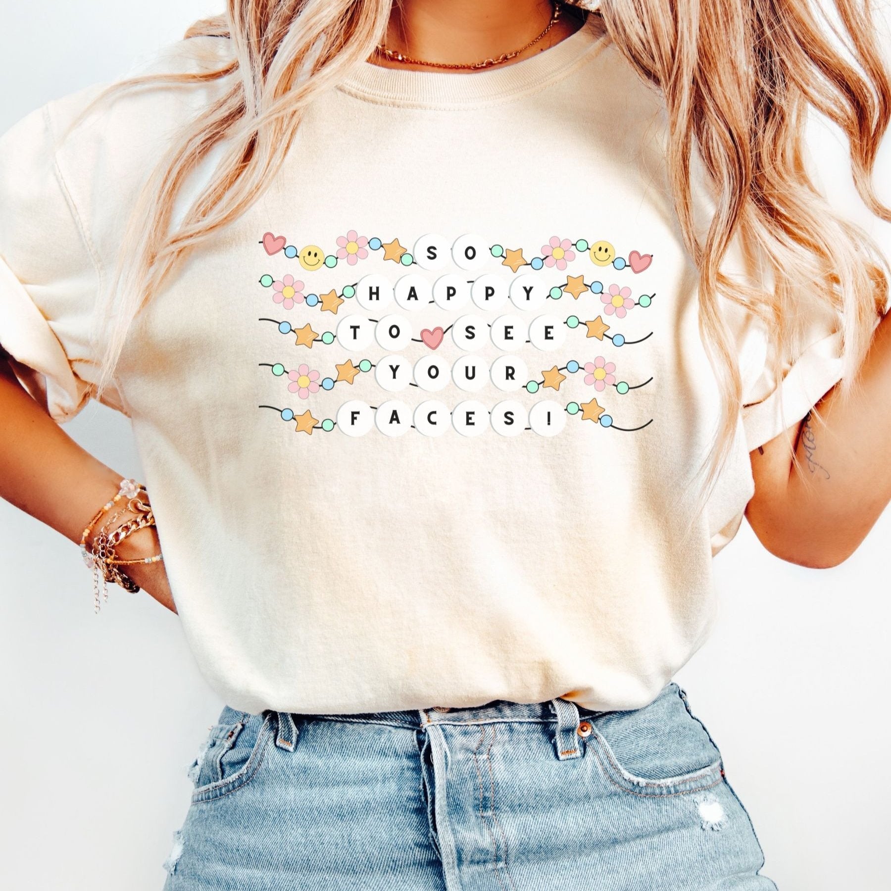 Welcome the new school year with our charming Friendship Bracelet Tee, perfect for teachers and paraprofessionals! Featuring the heartfelt message, "So Happy to See Your Faces," and adorned with a colorful graphic of friendship bracelet beads, this shirt is a delightful way to express your excitement for reconnecting with students and colleagues. Made from soft, breathable fabric for all-day comfort, this tee is ideal for the classroom, meetings, or casual outings. Celebrate the joy of togetherness and the special bonds of the school community with this cheerful and stylish T-shirt.