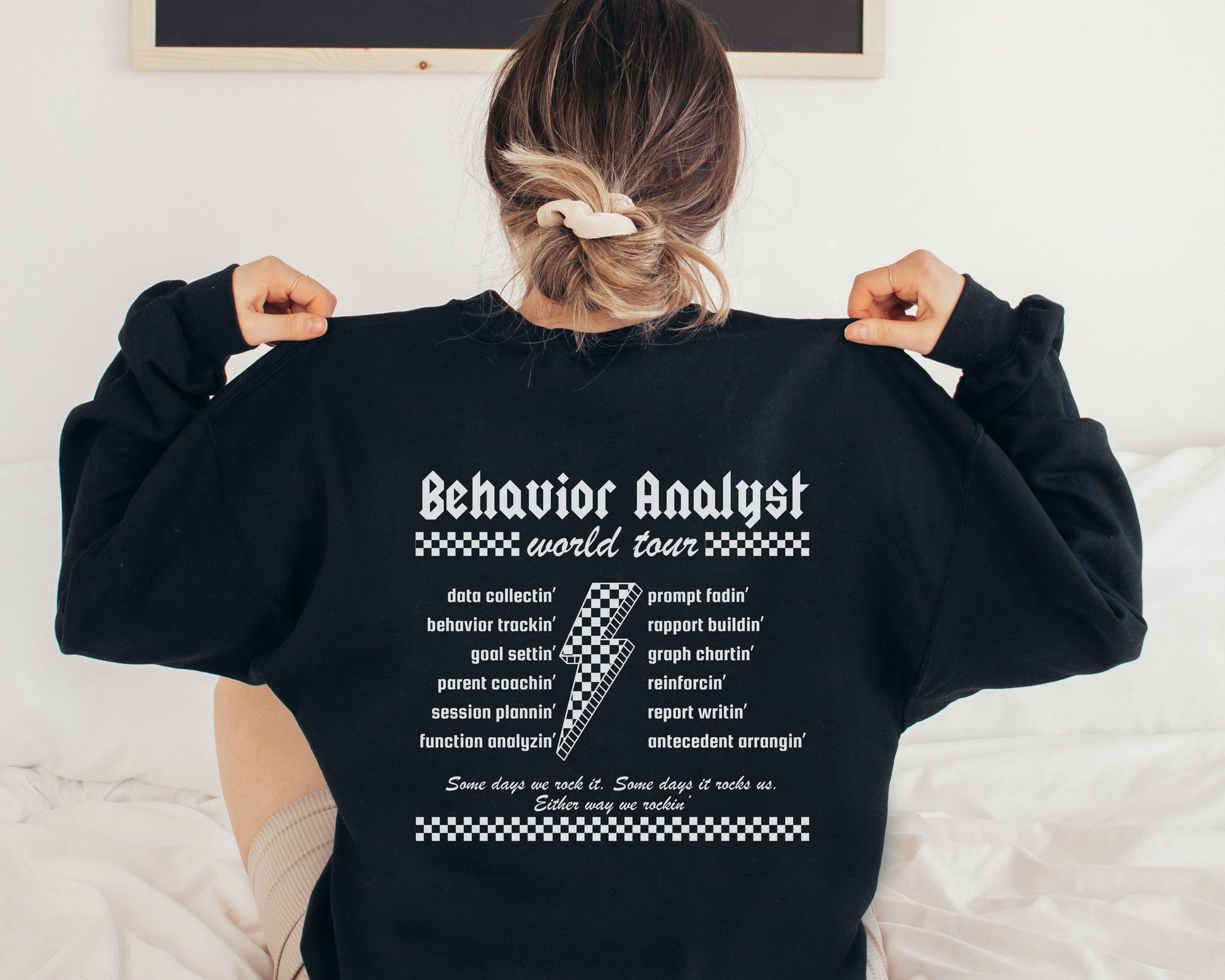 Get ready to rock the world of behavior analysis with our exclusive "Behavior Analyst World Tour" sweatshirt! Featuring a playful design that celebrates the everyday heroes of behavior science, this behavior analyst crewneck highlights the essential duties of a behavior analyst, like "data collectin'," "staff trainin'," and "report writin'." Perfect for professionals who handle challenging behaviors with skill and a sense of humor, this funny bcba tee is a must-have for those who know that making a difference is all in a day's work. Wear it proudly to show off your passion for behavior change and your fun, laid-back style! This also makes for a great gift for a bcba!
