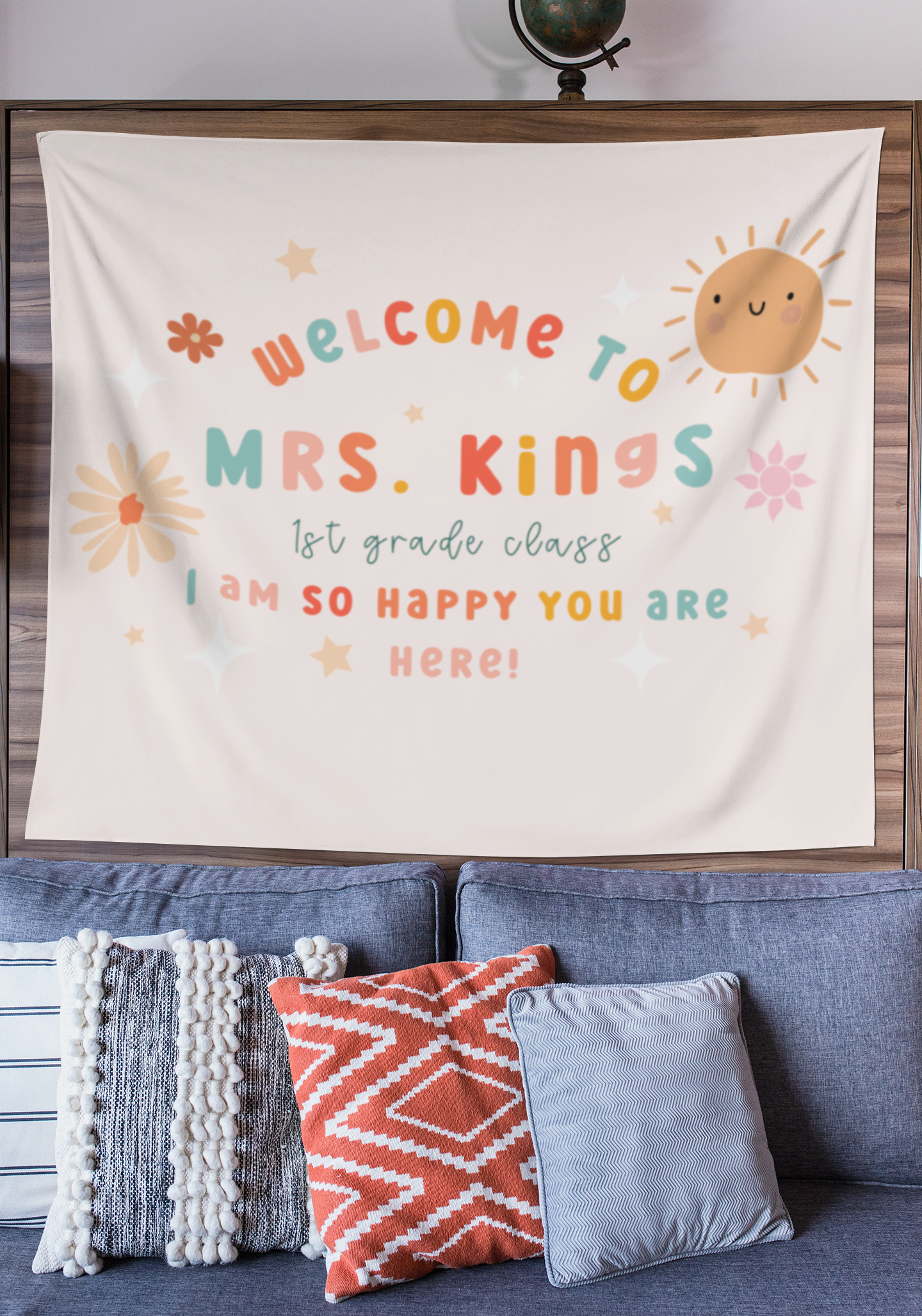 Transform your learning space with our charming boho-style classroom tapestry that welcomes students and can be personalized with your name. Crafted with attention to detail, this tapestry adds a touch of nostalgia and warmth to any educational environment. Featuring vibrant colors and a timeless design, it's the perfect decor piece to inspire a positive and inviting atmosphere for students and educators alike. Elevate your classroom aesthetics and create a space where every day is a beautiful day to learn.