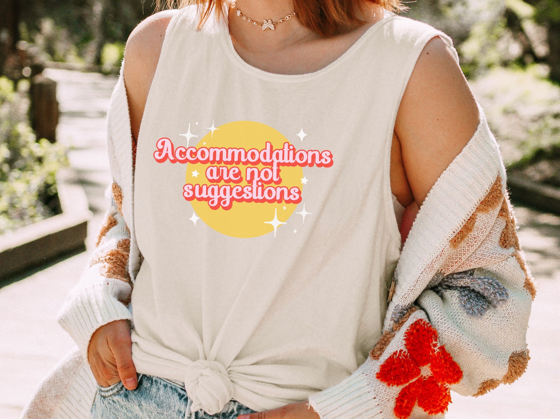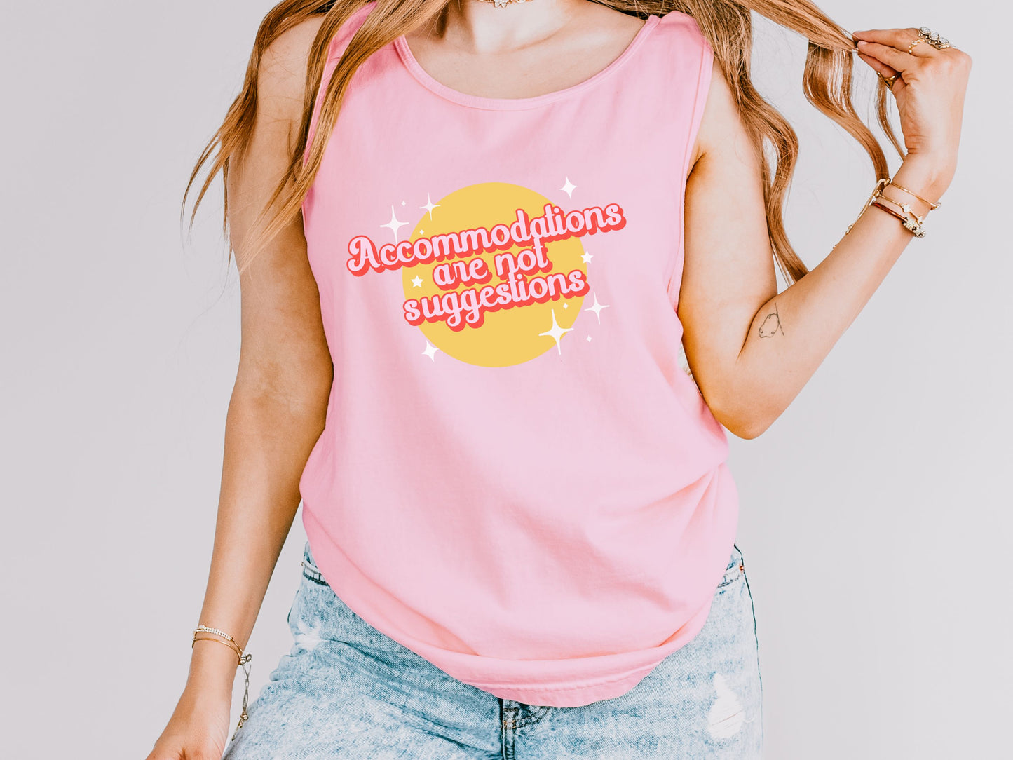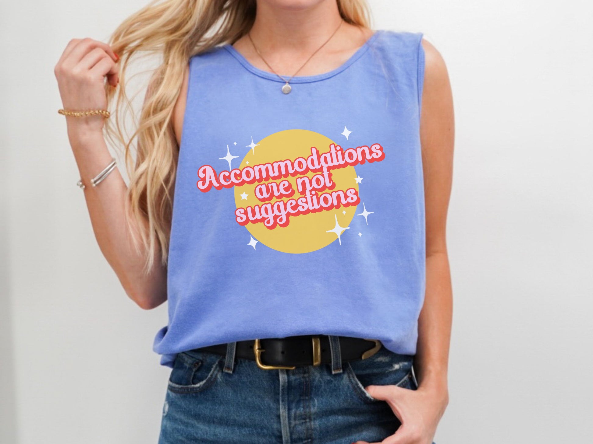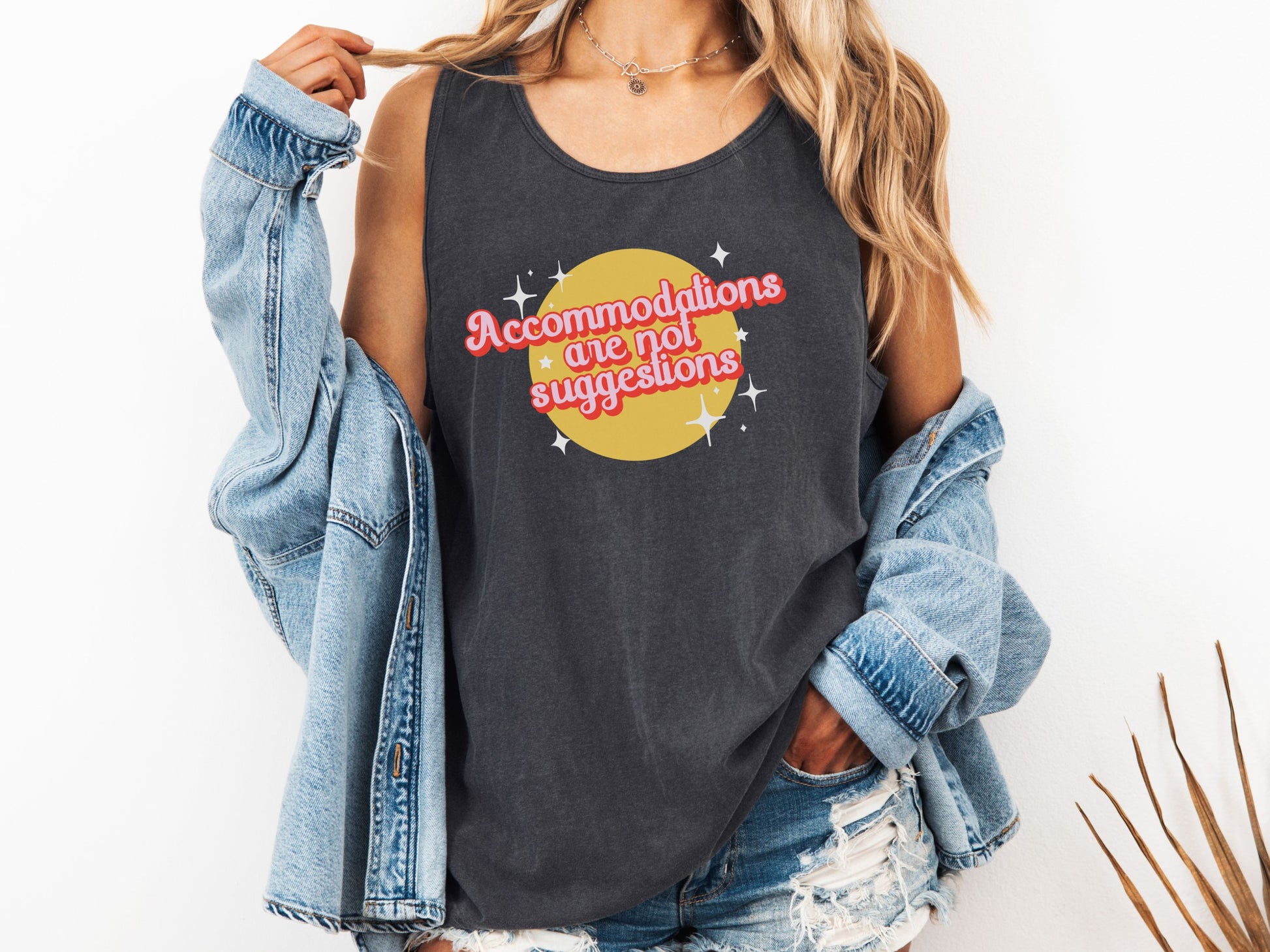 Embrace your advocacy spirit with our "Accommodations Are Not Suggestions" Retro Tank Top. This stylish piece combines a fun, retro design with a powerful message, making it perfect for spreading awareness and standing up for inclusivity. Made from soft, breathable fabric, it's comfortable for any occasion, whether you're at a rally or hanging out with friends. Make a bold statement and show your commitment to equality with this unique and eye-catching tank top.