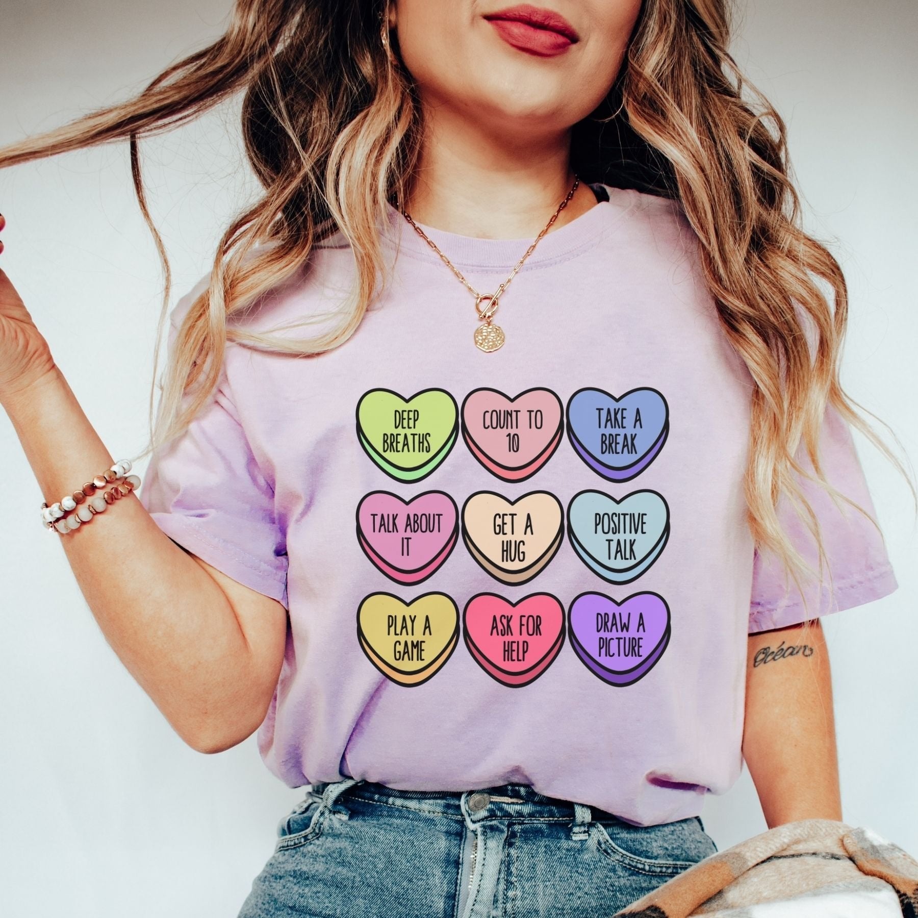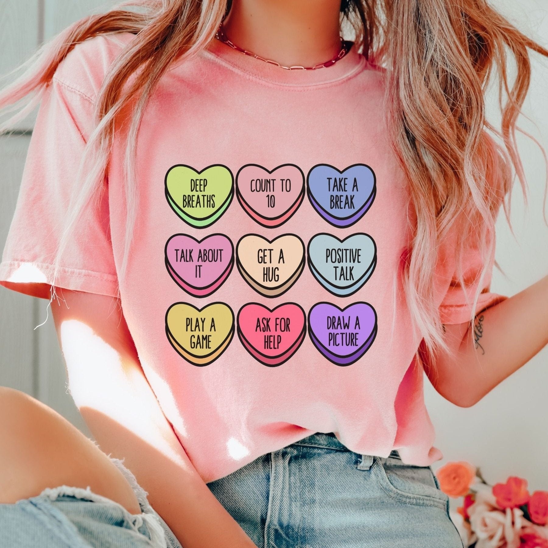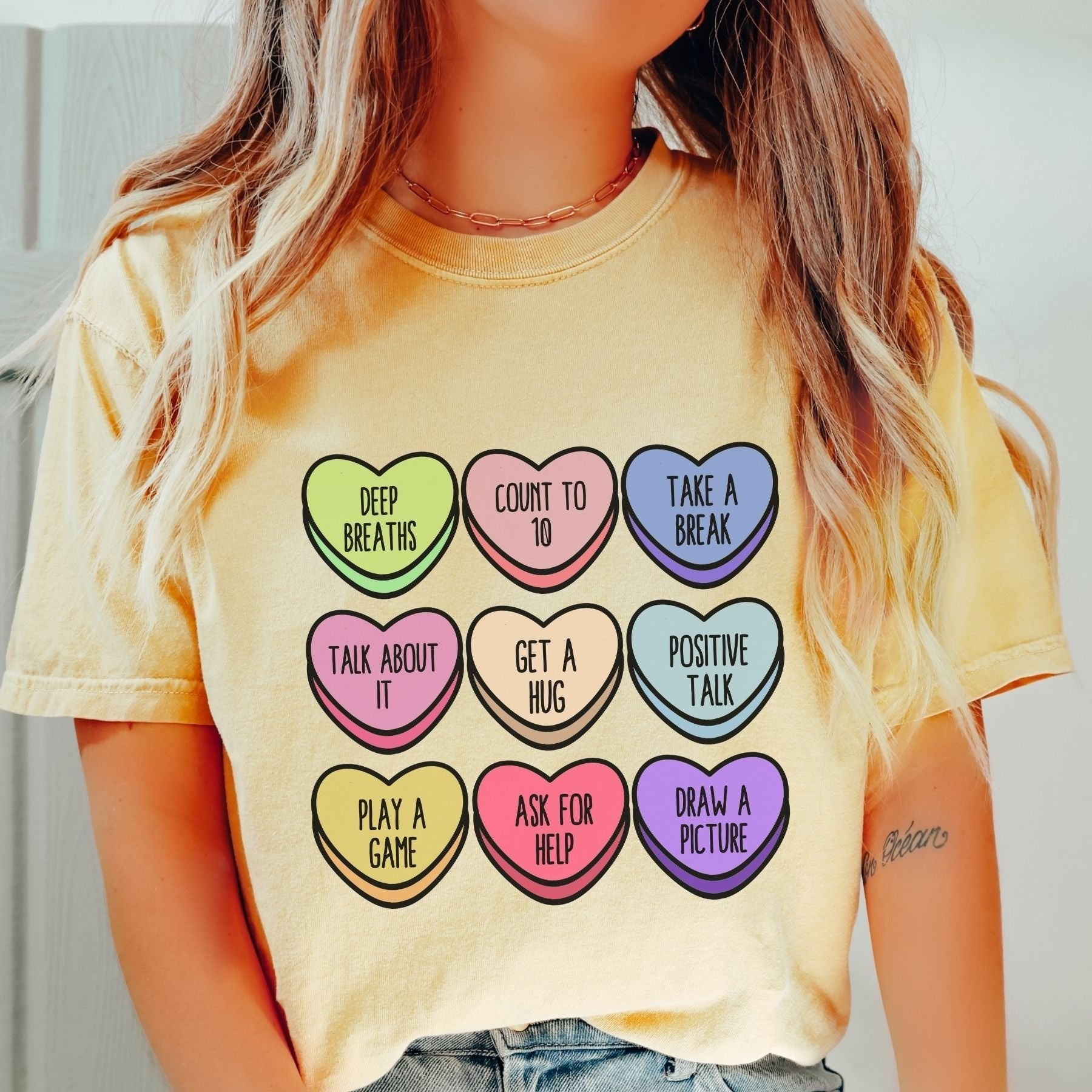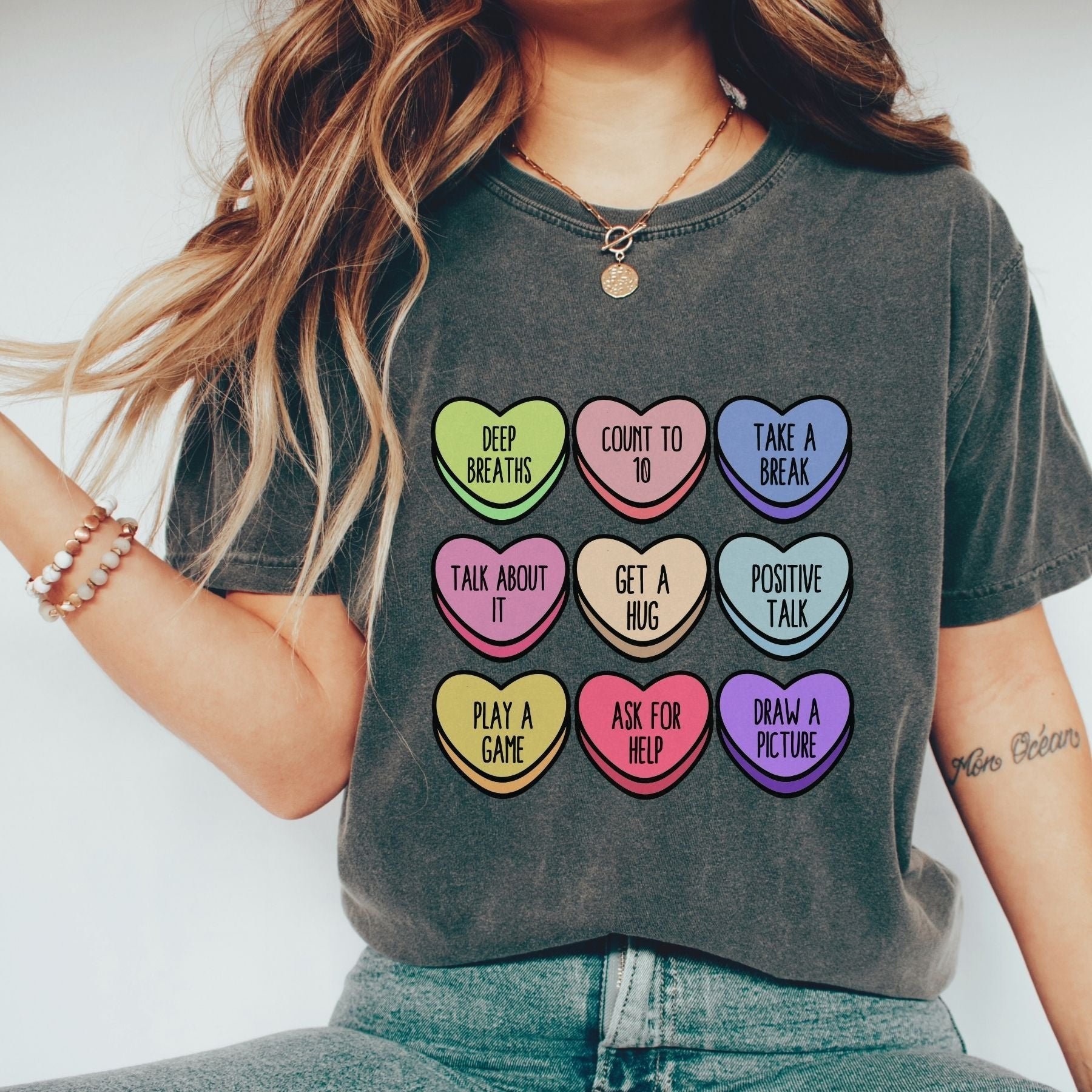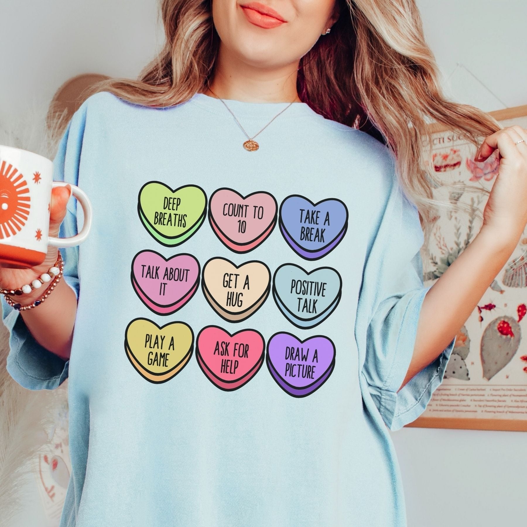 Introducing our Conversation Hearts Coping Strategies Shirt – a wearable reminder that style meets self-care! This unique design combines fashion with mental well-being, featuring a vibrant array of conversation hearts, each adorned with a powerful coping strategy. Express yourself with a tee that not only looks good but also serves as a daily dose of positivity. Whether you're facing stress, anxiety, or just navigating the challenges of daily life, let your shirt be a source of comfort and inspiration.
