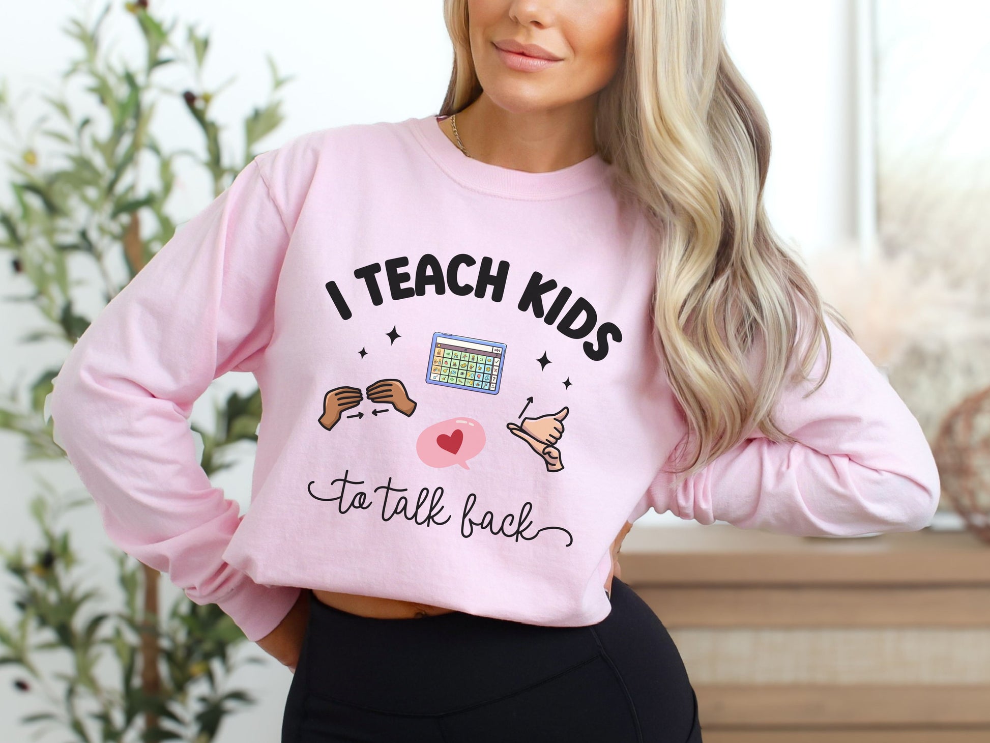 Elevate your speech therapy wardrobe with our "I teach kids to talk back" long sleeve shirt for speech therapists and speech therapist assistants! Crafted from soft, breathable fabric, this tee combines comfort with a fun, vibrant design perfect for any slp or slpa. Whether you're in the clinic or home setting, or enjoying a casual day out, this shirt proudly showcases your passion for speech therapy. Get ready to inspire with style and let everyone know your passion! This will also make for a great gift for a slp or slpa.