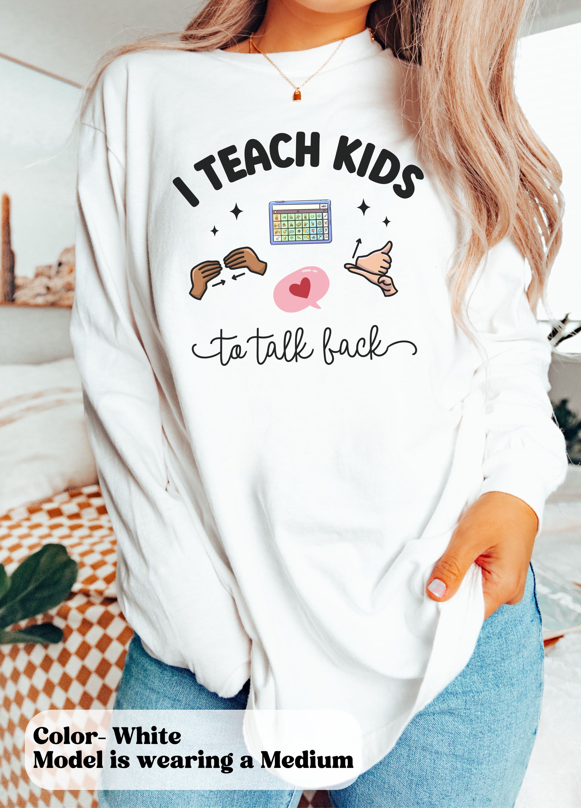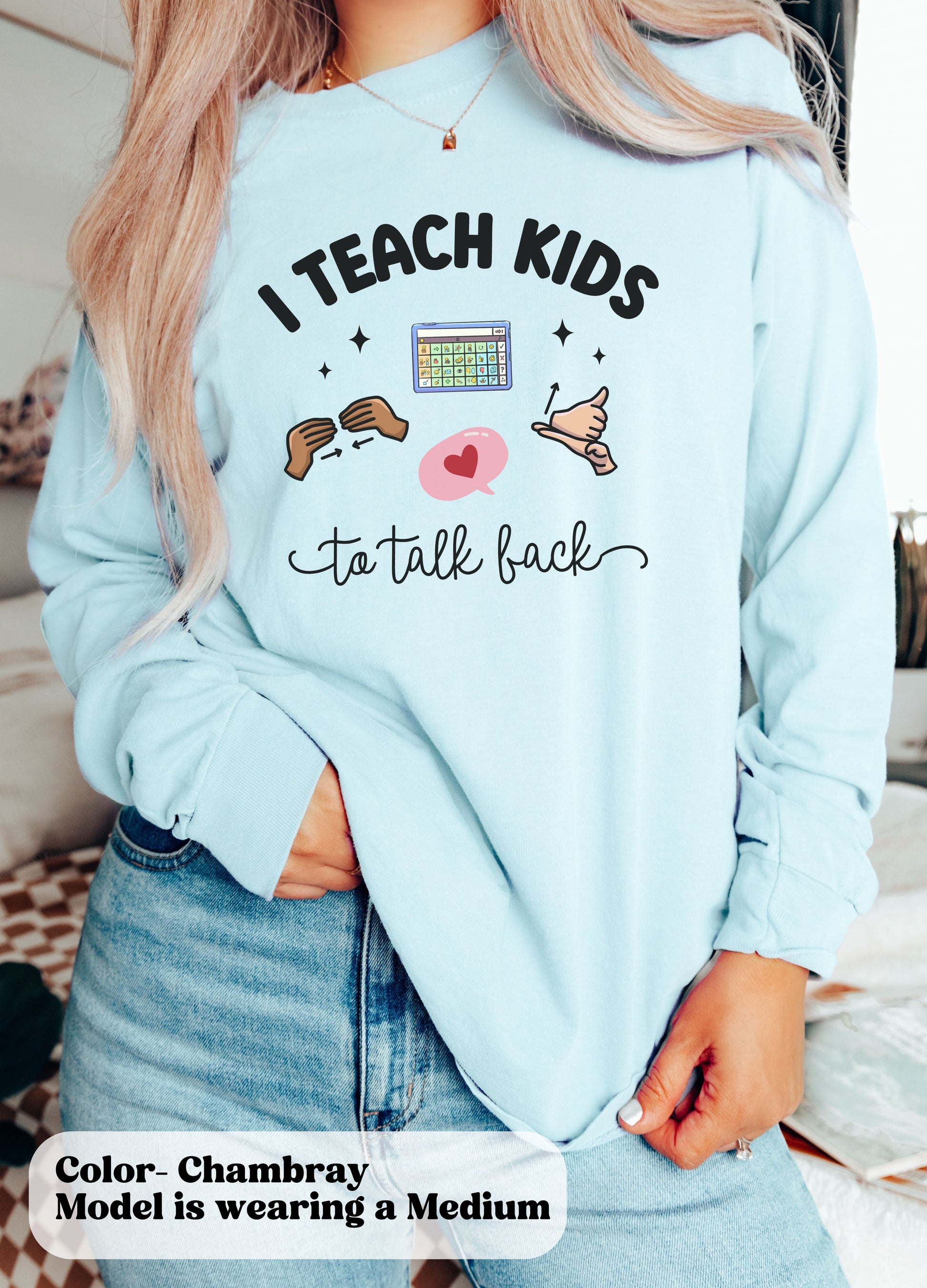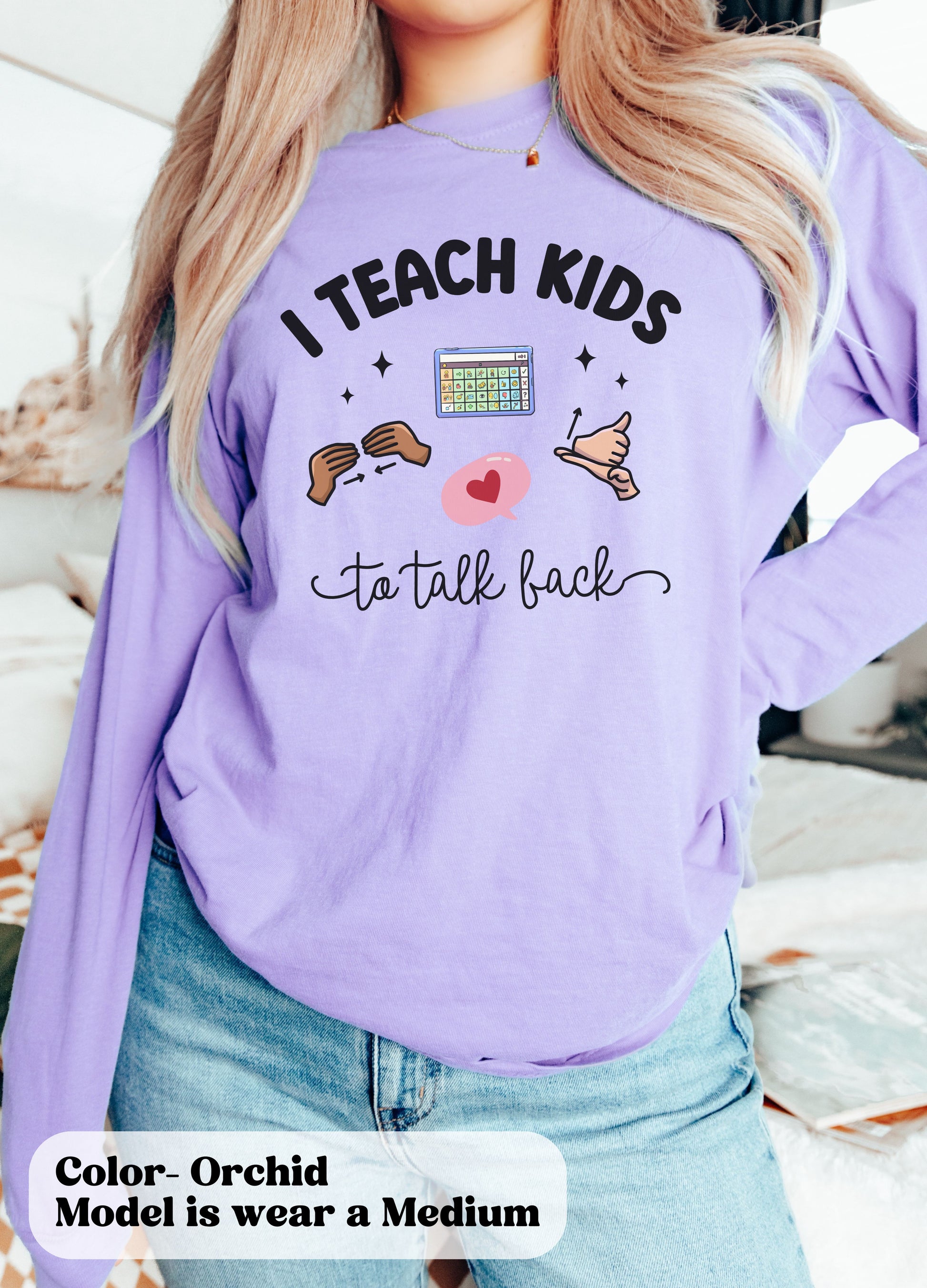 Comfort Colors Funny Speech Therapy Long Sleeve T-Shirt for SLPs and SLPAs, I teach kids to talk back Tee, gift for peds speech therapist