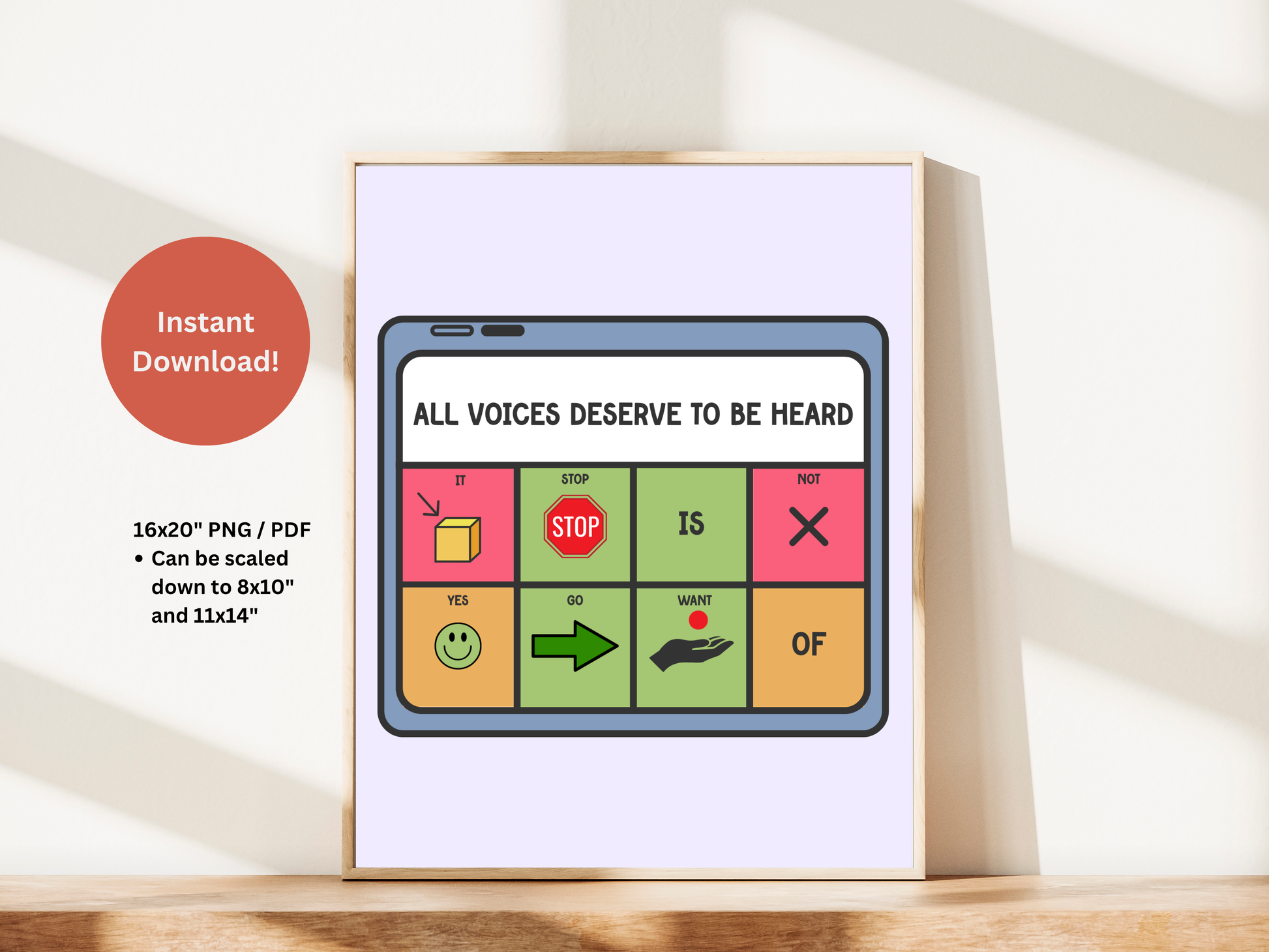 Celebrate and advocate for communication access with this AAC-inspired digital download. Featuring the empowering message “All voices deserve to be heard” displayed inside an AAC device, this design is perfect for spreading awareness during AAC Awareness Month (October) — and year-round.