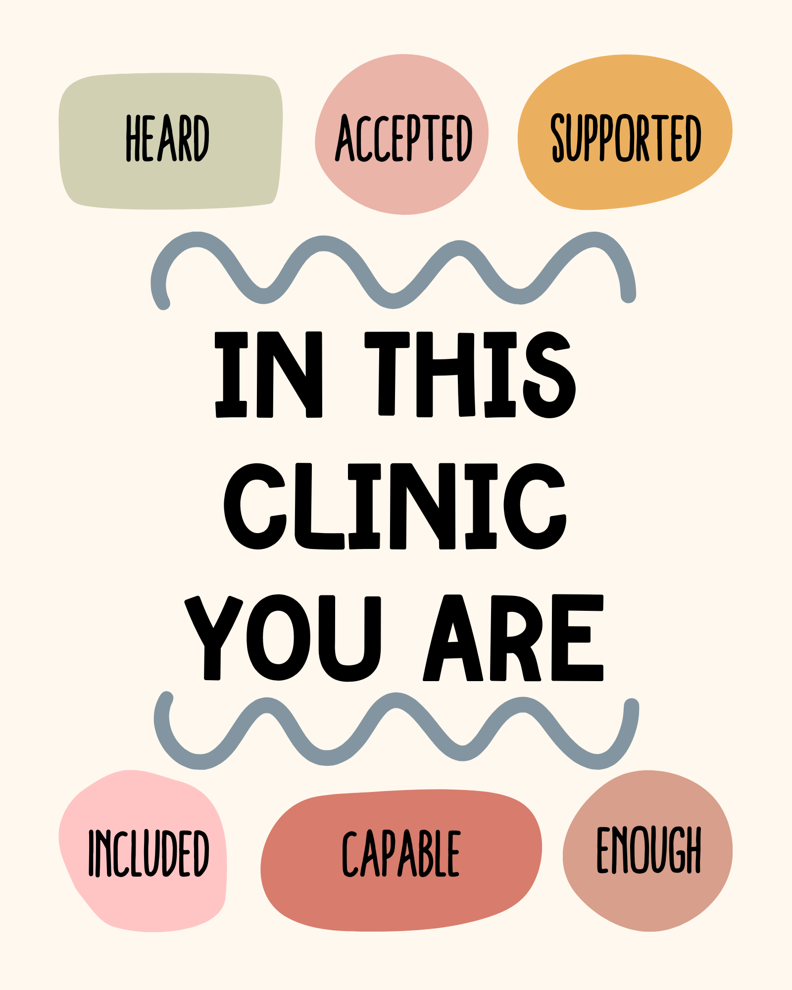 Enhance your clinic with our "In This Clinic You Are" Acceptance Free Digital Print. There is so much power our words hold, especially when we are inviting others into our space. Spread the message of acceptance and inclusion with this poster.