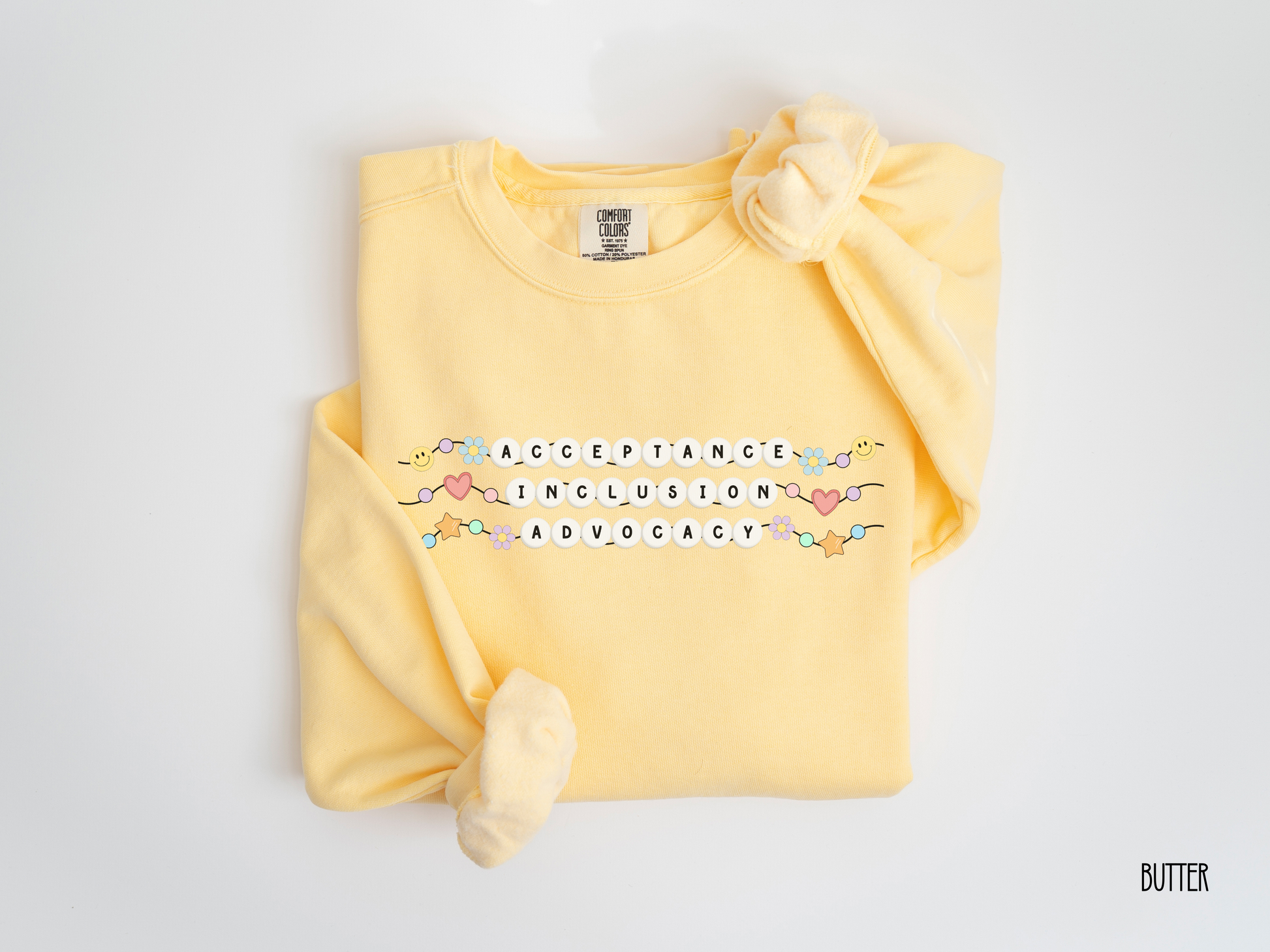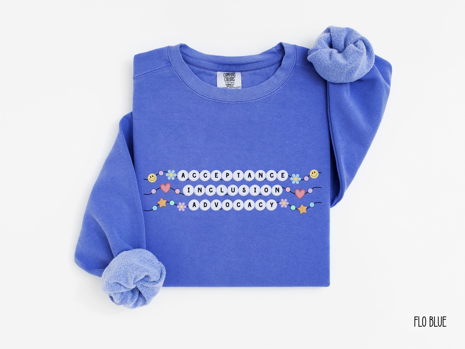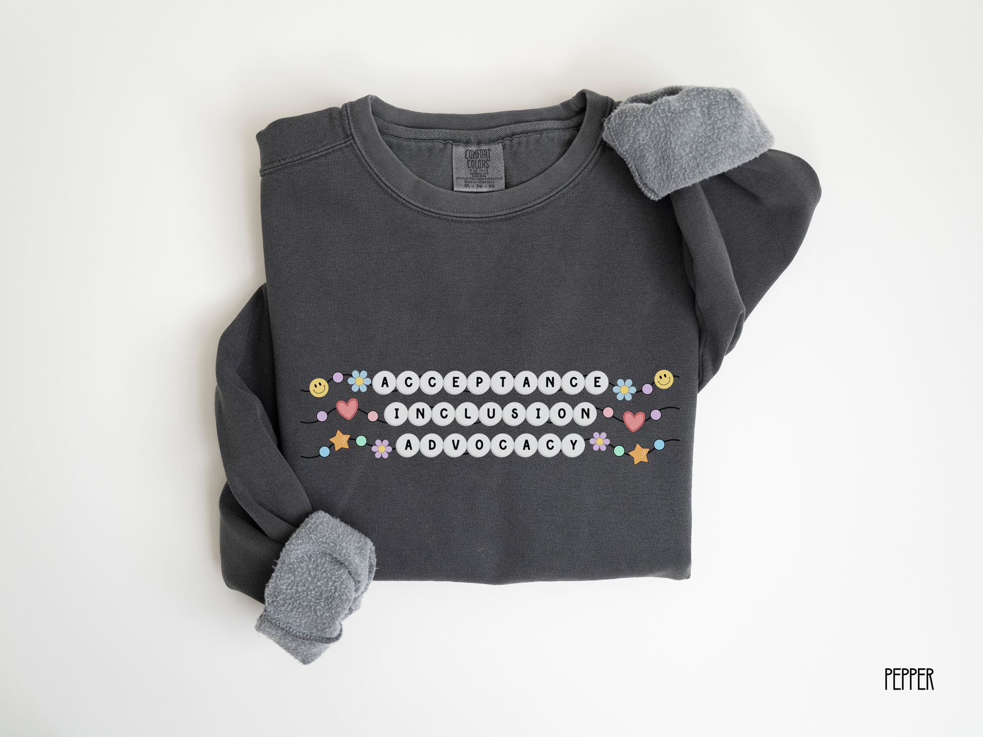 Wear your advocacy proudly with this Inclusion & Acceptance Friendship Bracelet Sweatshirt! Featuring the words "Inclusion, Acceptance, Advocacy" in a fun friendship bracelet bead design, this design sparks conversation while promoting a message of acceptance for all. Perfect for teachers, advocates, and anyone who believes in a more inclusive world.