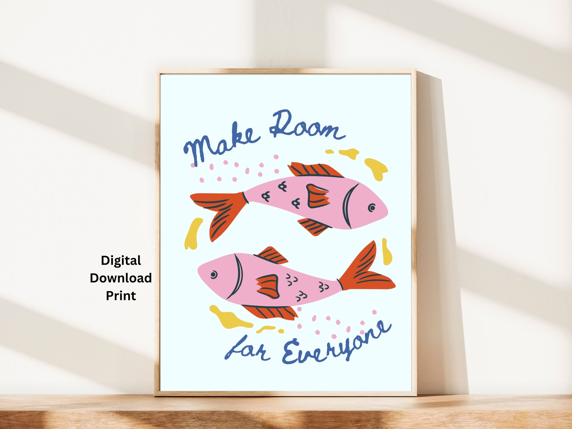 This free printable features the phrase “Make Room for Everyone” paired with a simple fish design, symbolizing inclusion, community, and making space for differences.