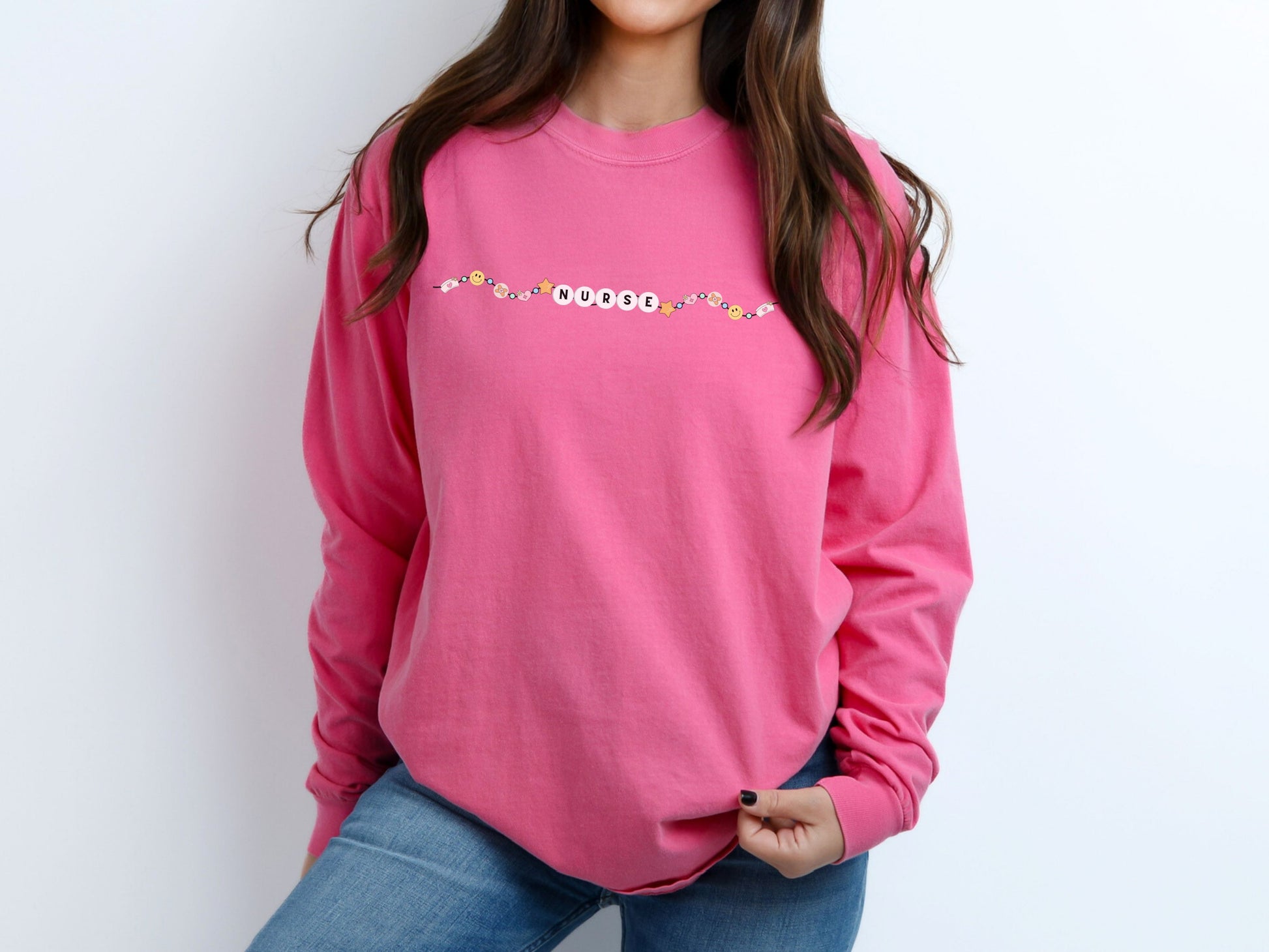 Elevate your Nursing wardrobe with our one of a kind friendship bracelet themed long sleeve Nurse shirt! Crafted from soft, high quality cotton combines comfort with a fun, vibrant design. This is the perfect tee for a RN. Whether you're in the clinic, home, or enjoying a casual day out, this t shirt proudly showcases your passion! Product Description