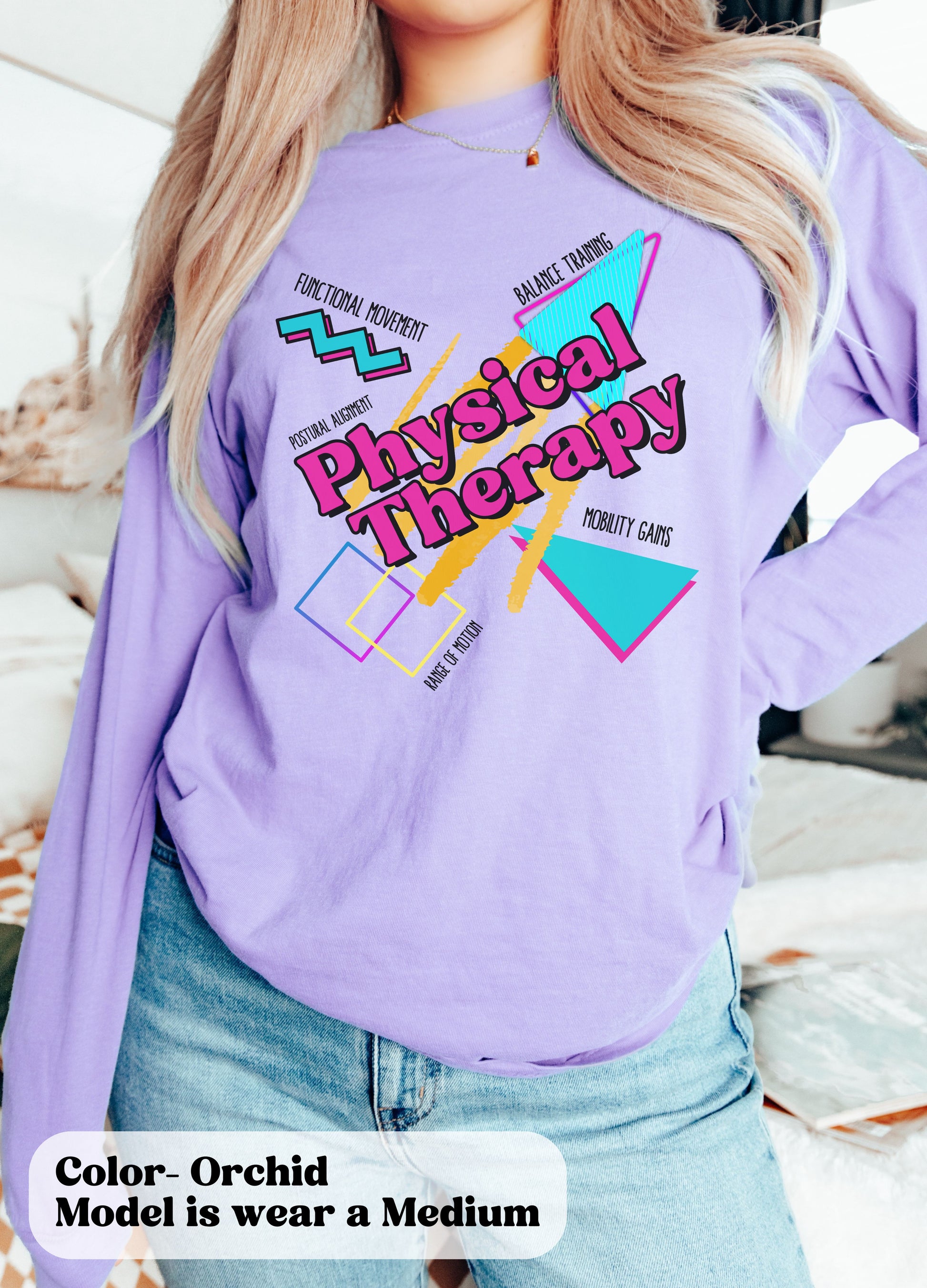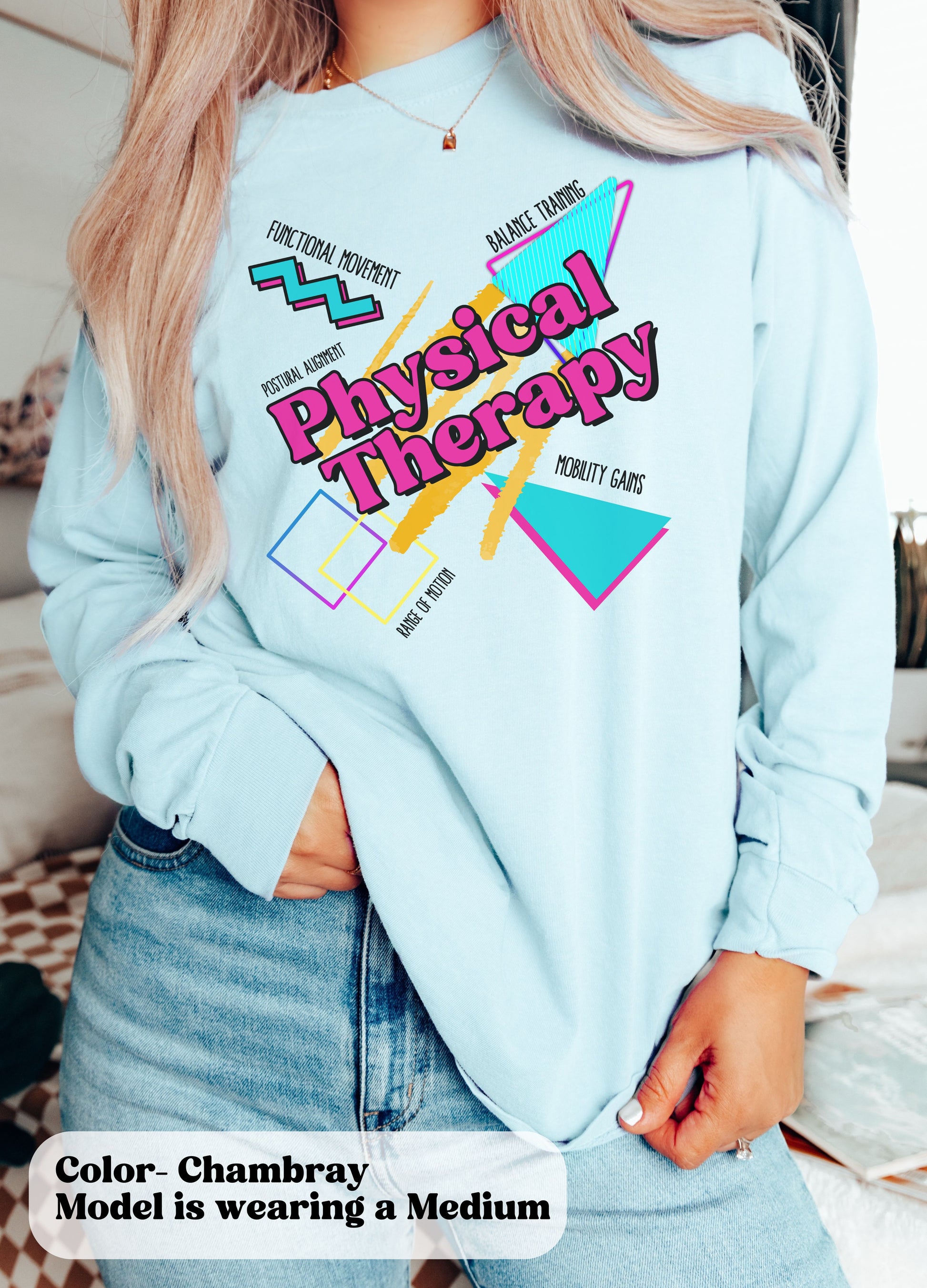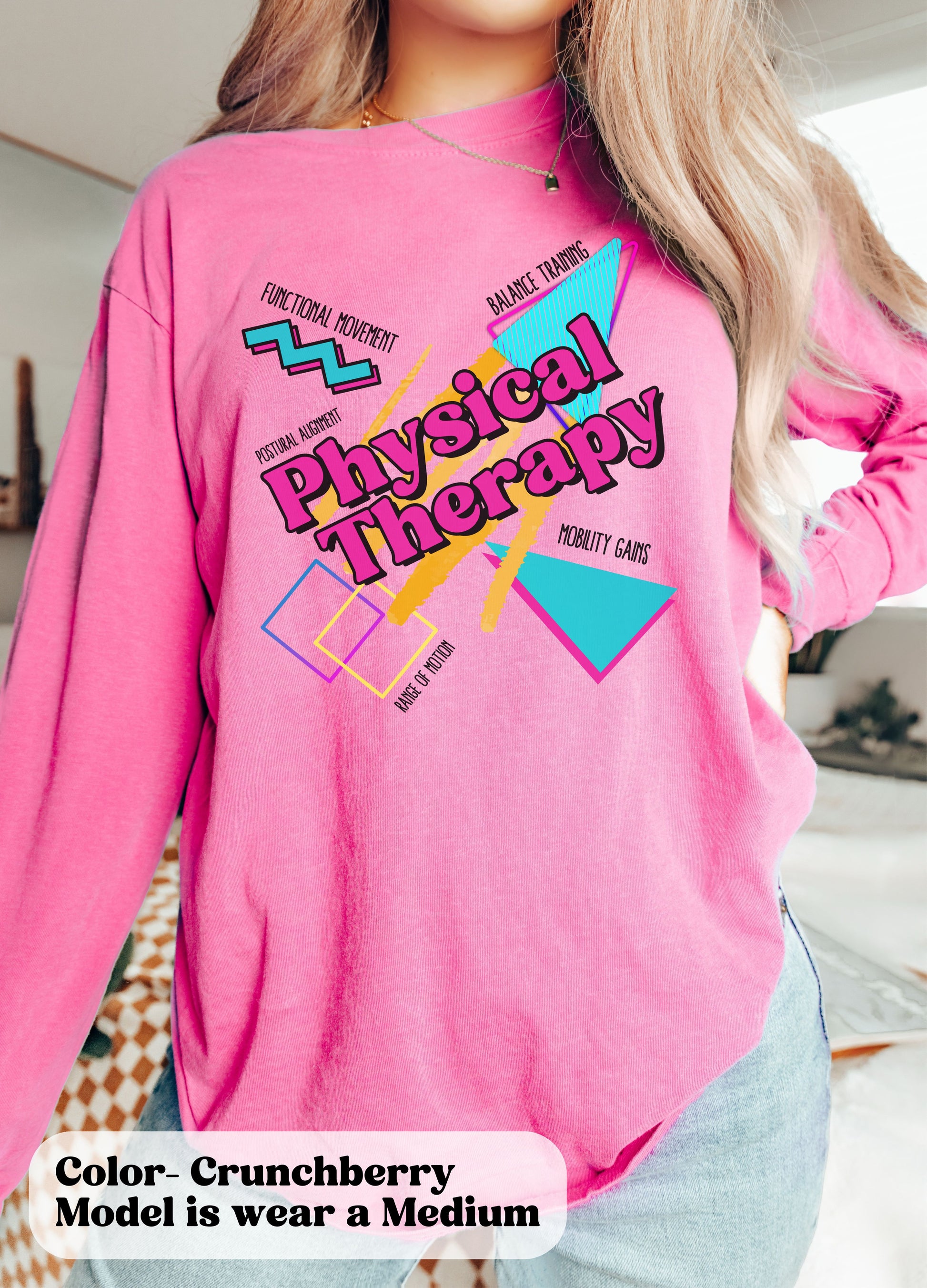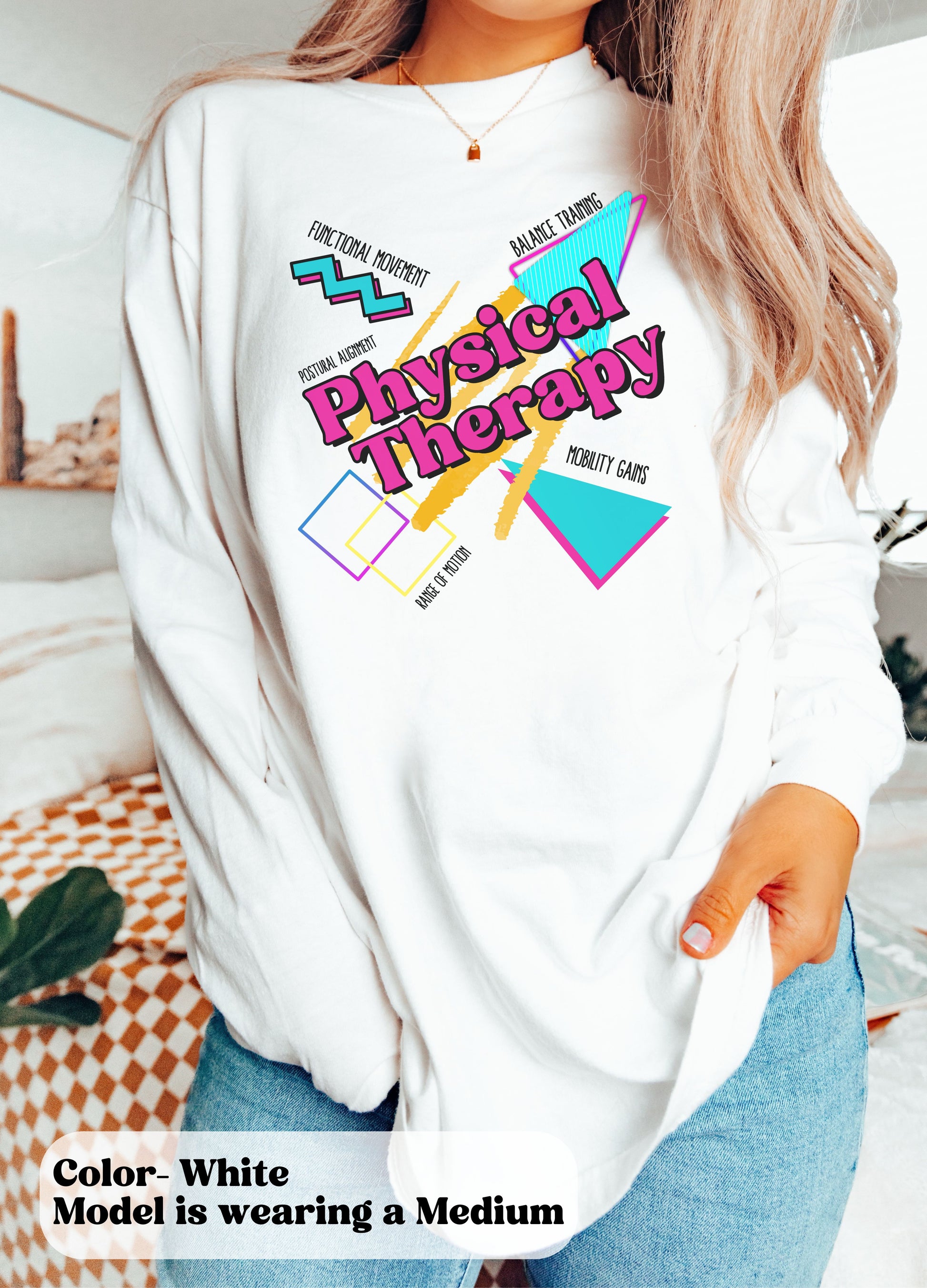 This Retro 90s styled long sleeve t-shirt designed for physical therapists and physical therapist assistants. Perfect for everyday wear or work attire. Ideal for physical therapy professionals and students, relevant for Physical Therapy Month and National Physical Therapy Day celebrations.