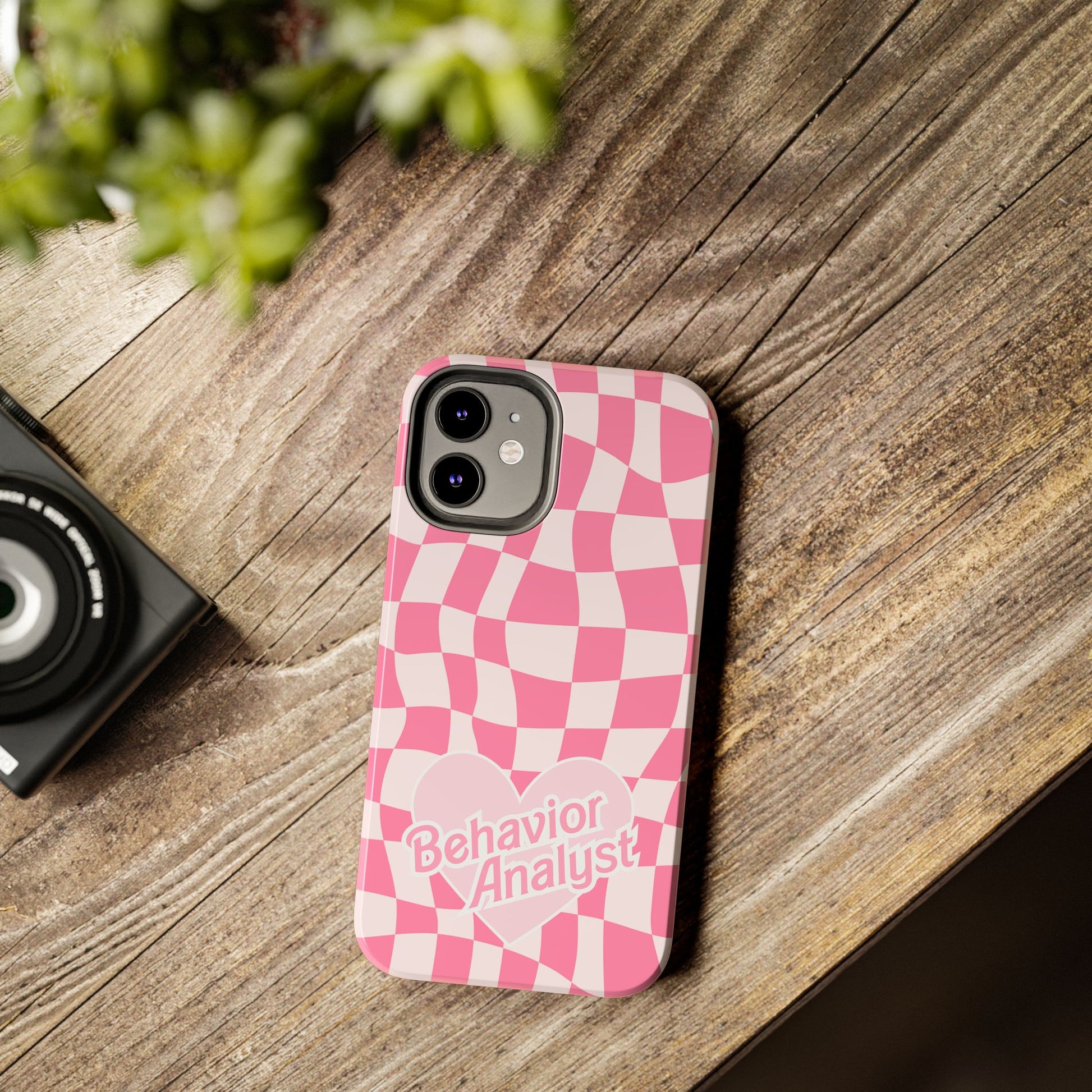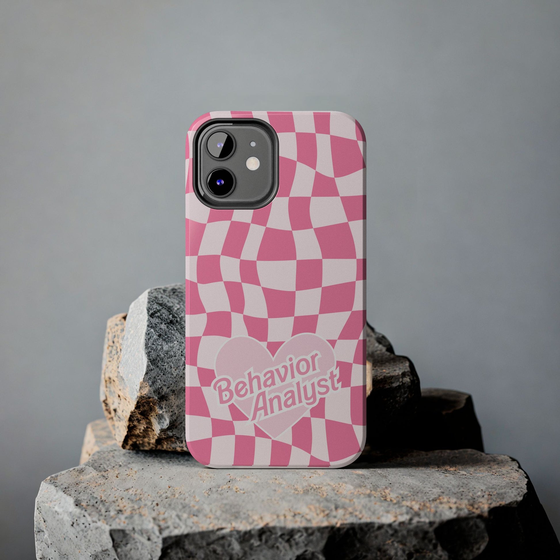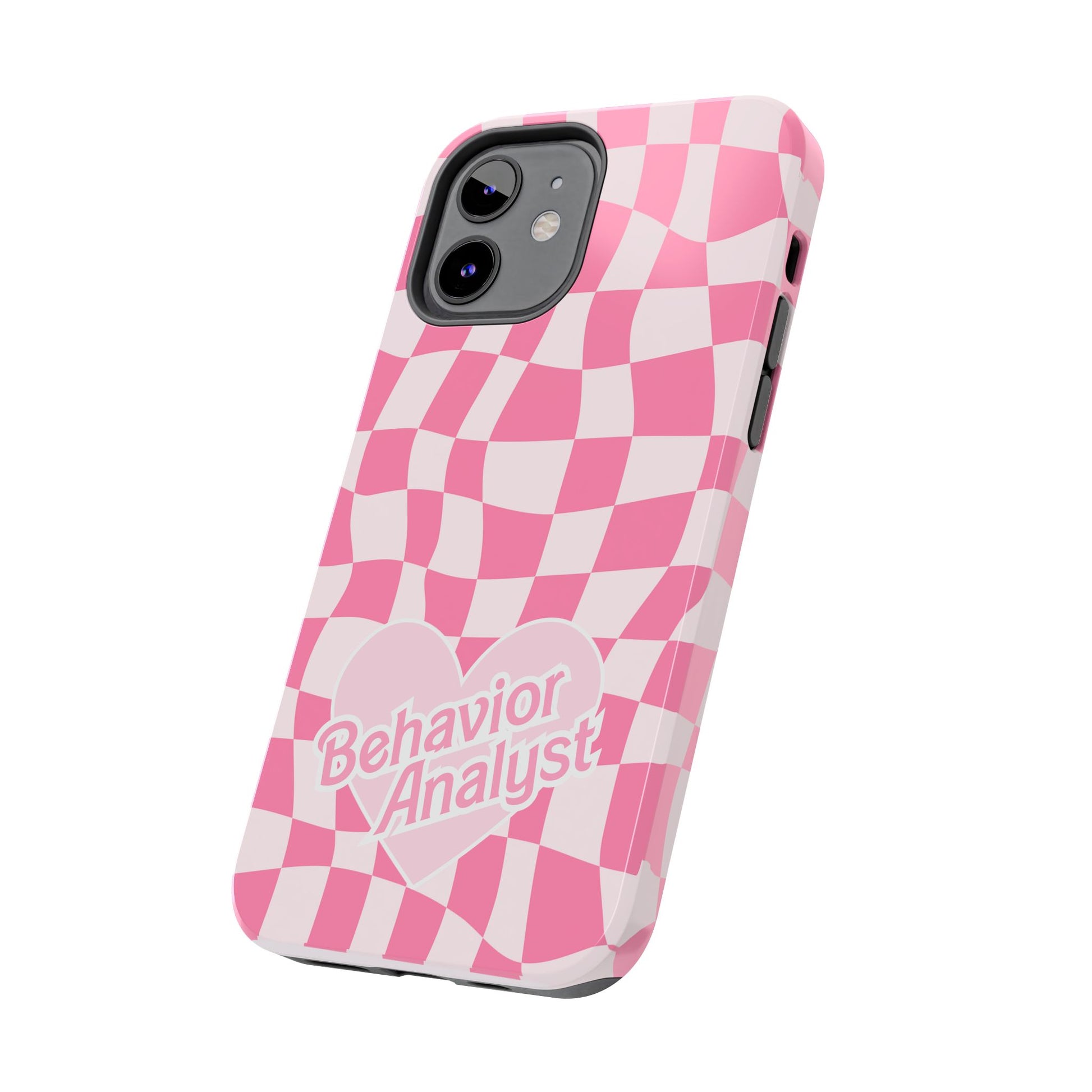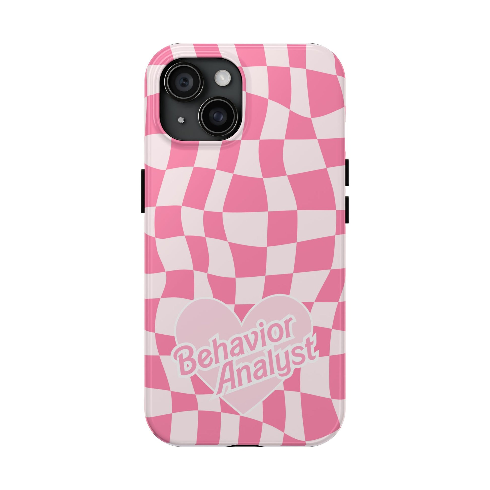 How cute is this pink bcba heart retro themed phone case for behavior analysts?! It features a really cute checkered pink background with a pink heart and behavior analyst labeled across it.