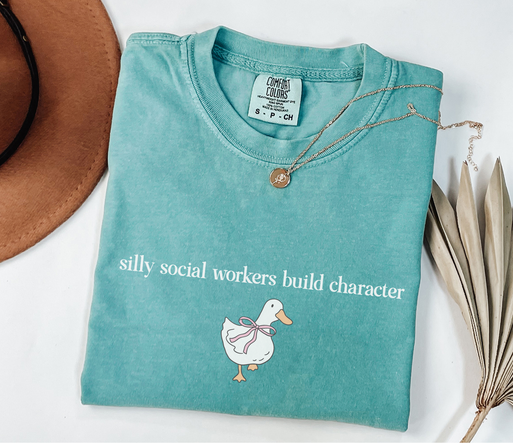 Bring a little joy to your day with this “Silly Social Workers Build Character” shirt – perfect for social workers who love to connect through fun and laughter! Featuring a quirky goose and a playful message, this comfy tee is a great conversation starter and a sweet reminder that being silly is part of the job.