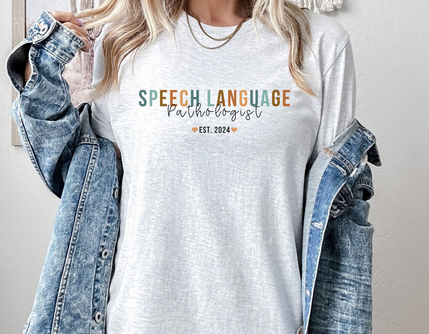 Show off your SLP pride with this personalized Speech Therapist EST. shirt! This shirt makes the perfect gift for yourself or for someone close to you who may have recently became a Speech Language Pathologist. Personalze with your EST year!