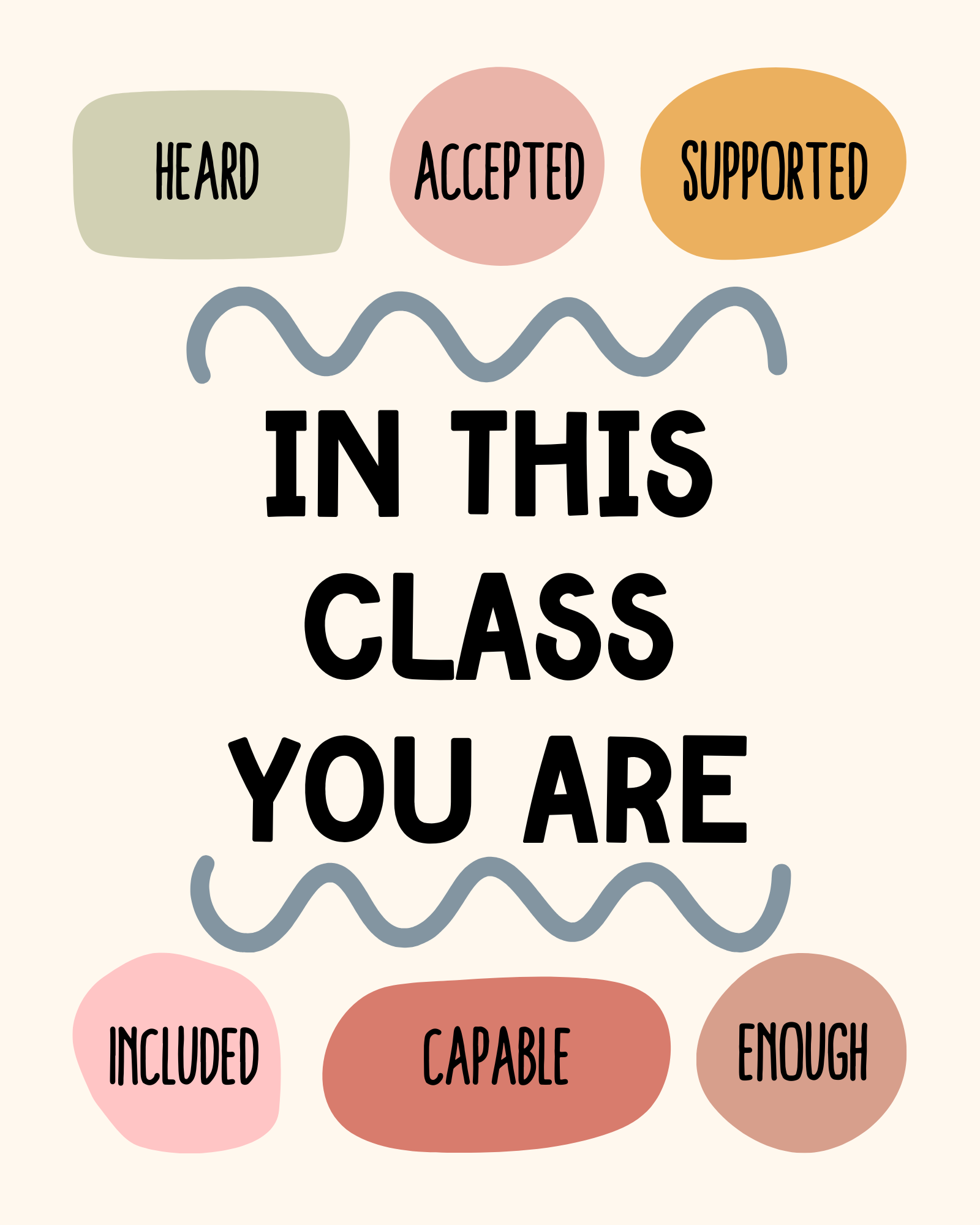 Enhance your classroom or clinic with our "In This Class You Are" Acceptance Free Digital Print. There is so much power our words hold, especially when we are inviting others into our space. Spread the message of acceptance and inclusion with this poster.